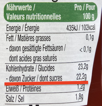 Viel aussagekräftiger sind unserer Meinung nach die Nährwertangaben auf der Verpackung der Lebensmittel. Hier wird nämlich die Gesamtmenge an Zucker (alle Zuckerarten) pro 100 g oder pro Stück angegeben. Diese finden Sie unter